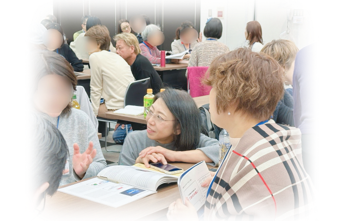 グループで実践ワークやディスカッションを行います。アウトプットを通して理解を深めるだけでなく、グループメンバー同士でタイムリーな気づきを与え合うような共時性も特徴です。